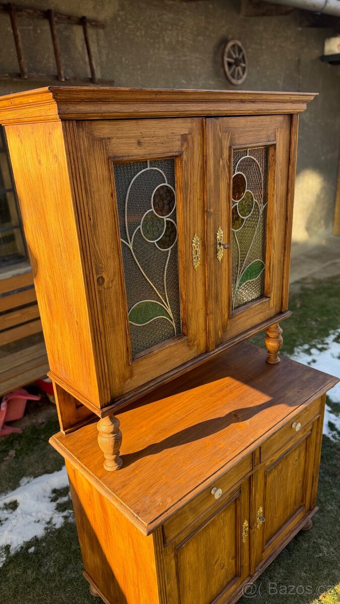 Krásný masivní kredenc ze smrku. Stáří cca 100 let. Byl kompletně rozdělaný, vybroušeno, oprava defektu, nanesen tvrdý voskový olej a uvnitř barva v původním odstínů. Krásné vitrážové původní skla, mosazné kování původní, knopky keramika s mosazným vrutem. Rozměry 200x110x57 v.š.h. . Prohlídka a odběr možný v Jankovicích u Holešova. Po domluvě můžu dovést k vám domů nebo na chalupu.