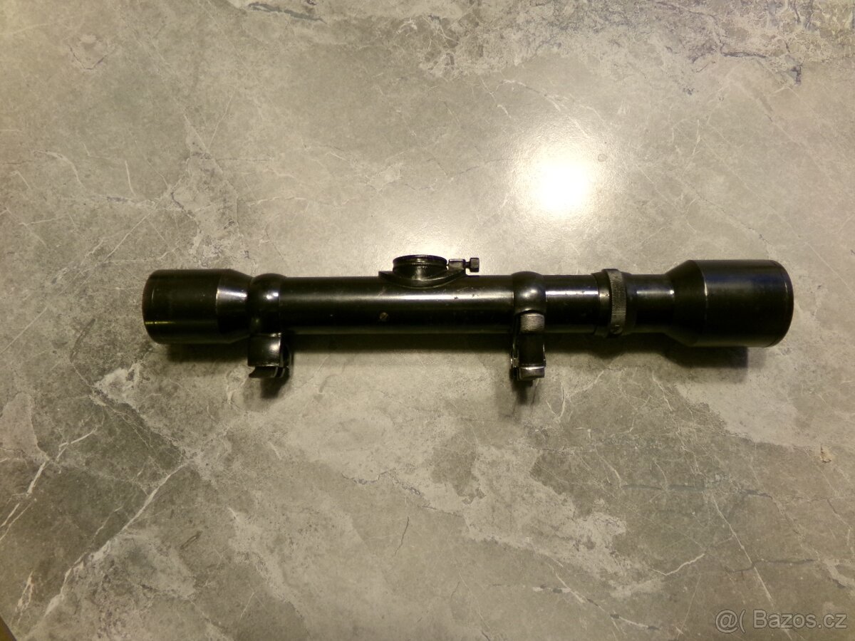 Prodám origo pěknou prvorepublikovou optiku na pušku Srb a Štys Praha Lovec 4*,používanou s oblibou Němci v počátku války na pušky Mauser K98k.Původní brynýr,ladění funkční.Původní montáž.Optika pěkně kouká,nerozpraskaná.Stav viz foto.