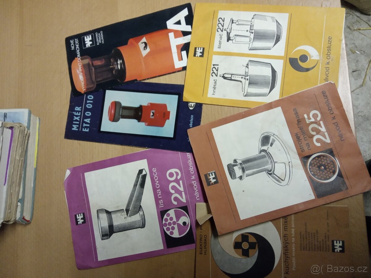 Retro staré originál návody na robot, lis, mixér ETA viz.foto.
