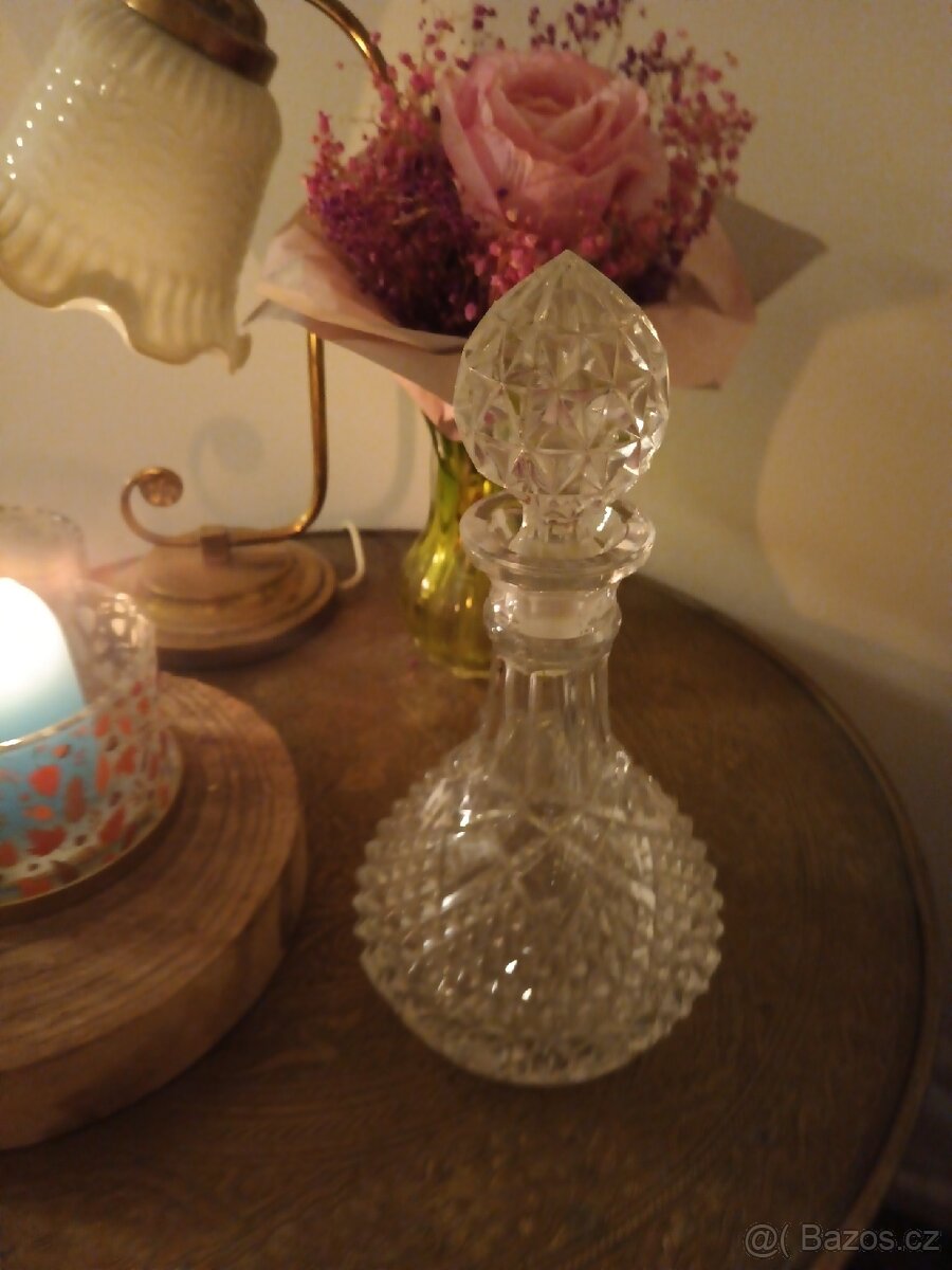 Nádherná, retro, skleněná, broušená karafa, má moc krásnou zátku, je nepoužitá, v původní krabici, délka 30 cm.