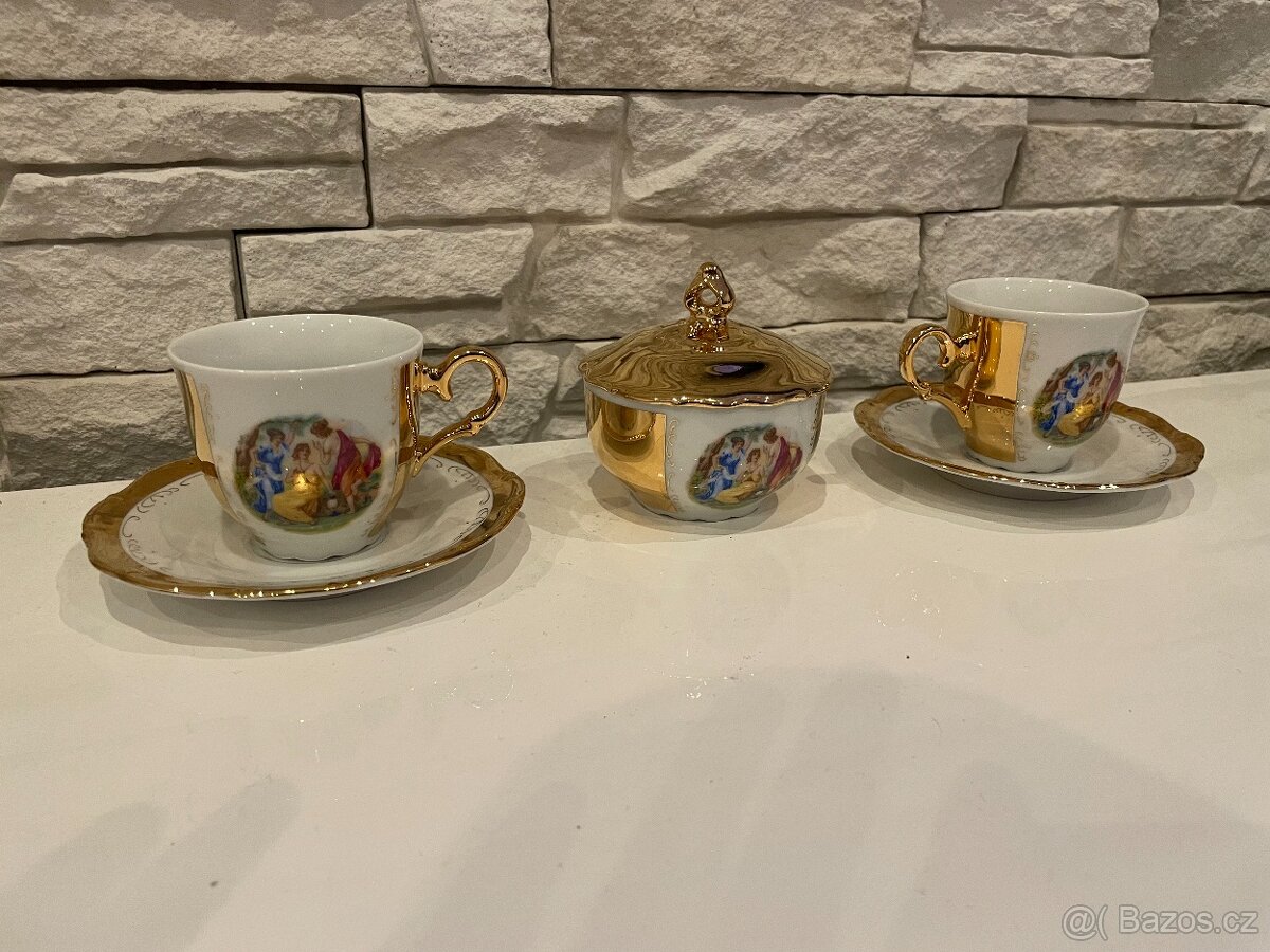 Přátelský porcelánový set tři grácie. 2x sálek + podšálek a cukřenka.
