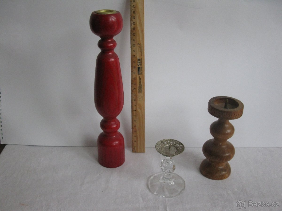 Červený svícen dřevěný 175,-Kč,dřevěné prodaný, skleněné za 55 Kč. Soška porcelánová 15 cm Panenka Marie s Jezulátkem,nepoškozená za 350,--Kč.Soška Krista výška 14 cm.za 299,-Kč.Vysoký,krásný svícen 60 cm,um.kování,1299,--Kč.Vhodný doplněk i ke grilování.