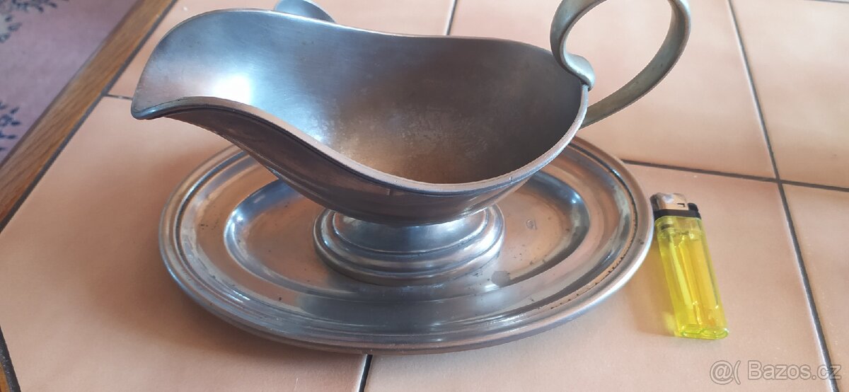 Omackovnik Rakousko Uhersko BERNSDORF, z předminulého storocia. Puncovano značkou Bernsdorf. Zachovalý muzeální kousek, s naběračkou téže značky. Obsah 0.4 litry vaha cca 1kg, větší rozmery. Délka tacu 23cm. Ušlechtilý kov, viz punce. Stáří cca rok 1880 .