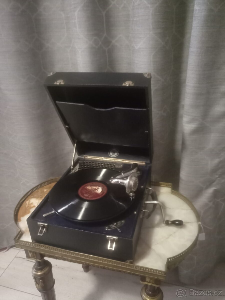 Kufříkový gramofon okolo roku 1930, perfektní stav. Vyčištěn, promazán, zcela funkční