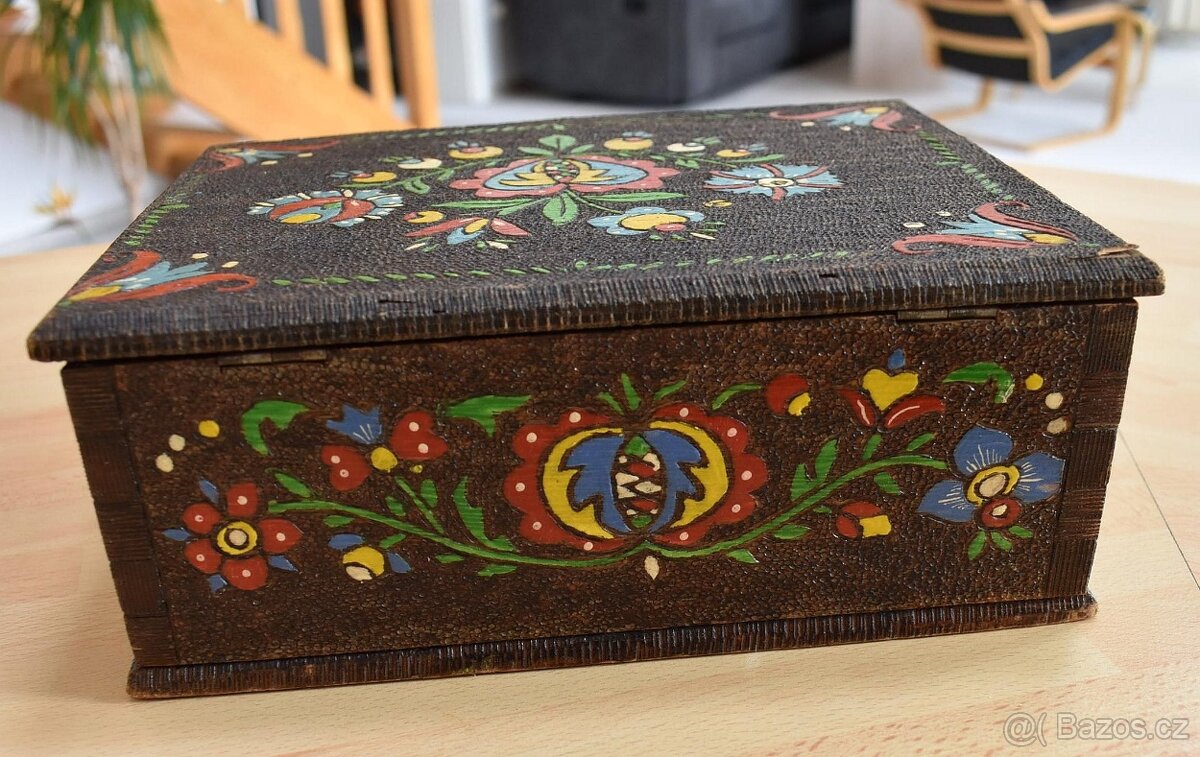 Ručně vyřezávaná a malovaná kazeta s moravskými motivy na víčku a všech čtyřech bočních stranách. Rozměry: 25 x20 x 10 cm. Cena tohoto vzácného kousku je 500,- Kč.