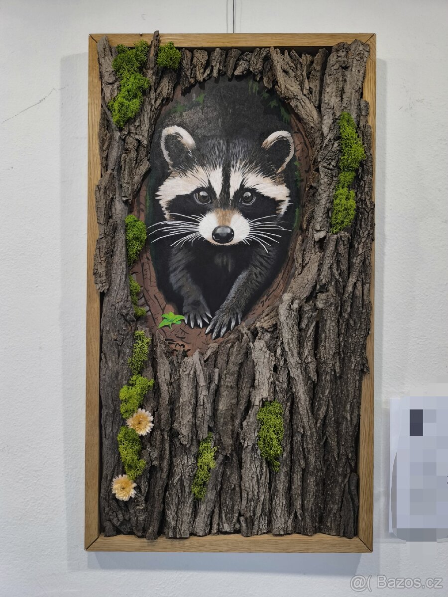 Vlastnoruční tvorba obrazu, akrylová malba, přírodní kůra, stabilizovaný mech, sušené kvítí. 73x40,5 cm.