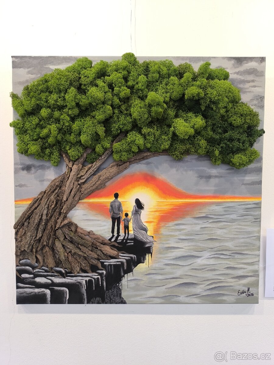 Vlastnoruční tvorba obrazu. Akrylová malba, stabilizovaný mech, přírodní kůra. 70x70 cm.