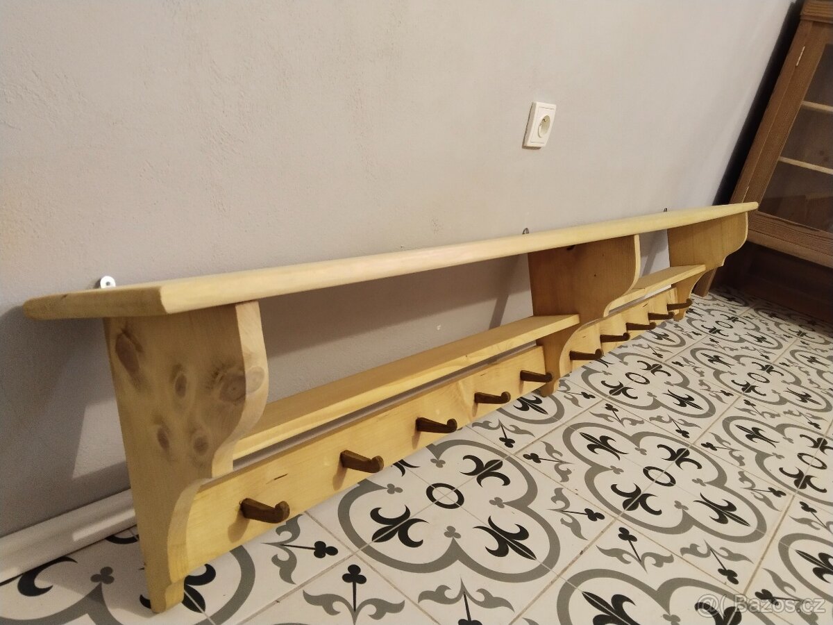 Velká, dlouhá, selská police. Je nově vyrobená podle starého vzoru. Bez povrchové úpravy čisté dřevo. Rozměry d. 197 cm, h. 24 cm, v. 35 cm. V případě zájmu poctivě zabalím a pošlu přepravní společností na náklady kupujícího.
