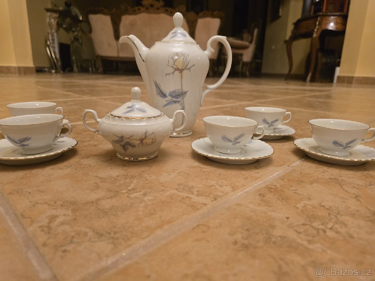 Krasny porcelanovy kavovy servis z roku kolem 1940 neposkozeny,nikdy nepouzity jen vystaveny ale chybi jeden podsalek.Je to Thun pokud se znovu vystavi ve vytrine nikdo nepostrehne.Prodavame z duvodu dedictvi a ponechali jsme si jiny na pamatku.Budem radi kdyz se dostane do dobrych rukou.Pokud mate radi silnou kavu tato sada by byla pro vas jako delana.