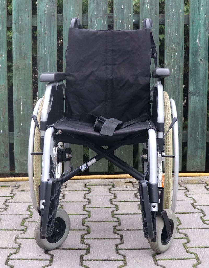 Mechanický invalidní vozík Meyra. Šíře sedu 42 cm. Hloubka sedu 45 cm. Výše zad 43 cm. Celková šíře 62 cm. Přední i zadní kola plná. Rychloupínáky. Brzdy pro doprovod. Držák na berle. Pás