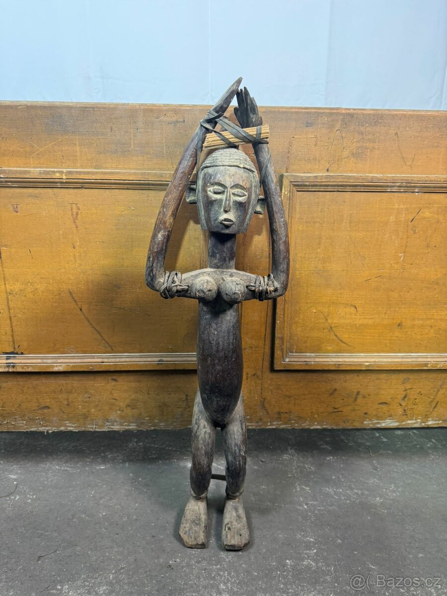 Výjimečná štíhlá figura s protáhlou hlavou, typickou pro kmen Mangbetu, kde prodloužená lebka symbolizovala krásu, urozenost a duchovní sílu.