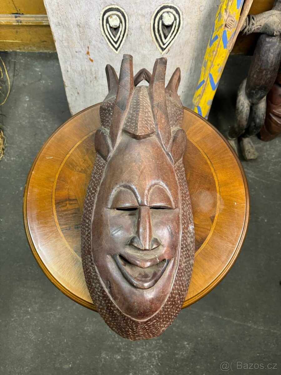Velká ručně vyřezávaná maska z tvrdého tropického dřeva, s výrazným usměvavým obličejem a bohatě zdobeným účesem.