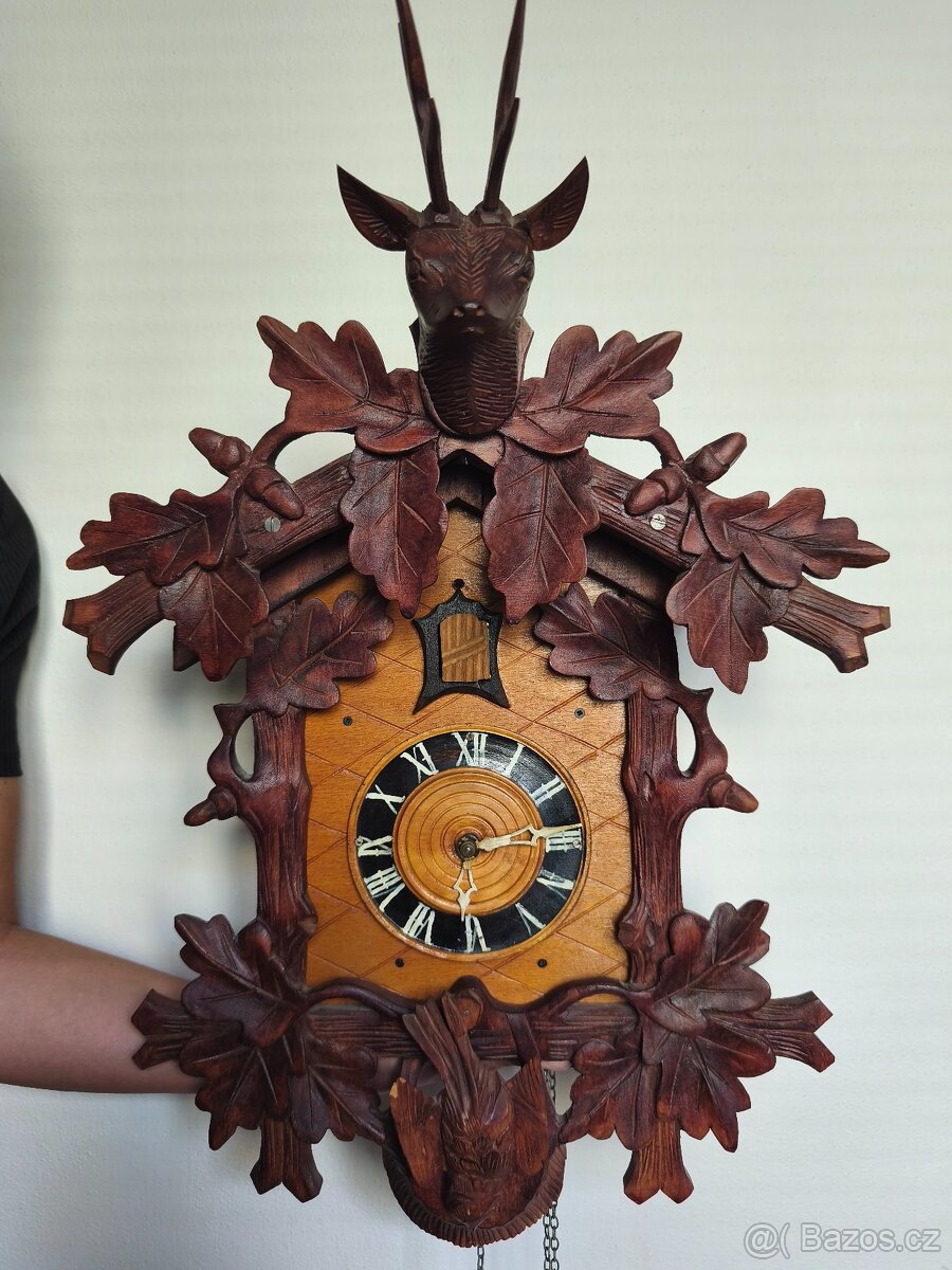Nabízím k prodeji nádherné staré, dřevěné a ručně vyřezávané hodiny, "kukačky" s malovaným ciferníkem ve stylu mysliveckém/lesnickém. Žádný ruský bakelit. Vhodné do útulných chat/chalup/baráků pro lidi co mají rádi retro vkus. Hodiny pochází z dědictví. Jelikož jsem nemehlo tak to neumím seřídit, ale znalý bude vědět. Mají dvě vady. Jedna z pohledu zepředu neviditelná a snadno opravitelná - stříška chce přilepit. To nechám na majitele a jedna minimálně rozpoznatelná - ptáček má ulomen kus křidélka, cca 2 milimetry. Což jde vidět jen zblízka. Vnitřek v perfektním stavu. Stav viz foto. Velikost cca 54x38cm. V případě dotazů se ozvěte.