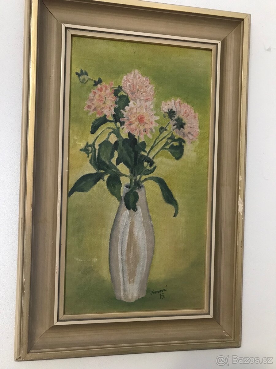 Nabízím obraz - kytice ve váze, z roku 1973, olej - autorka Věra Vovsová, vel. včt. rámu je 40x62 cm