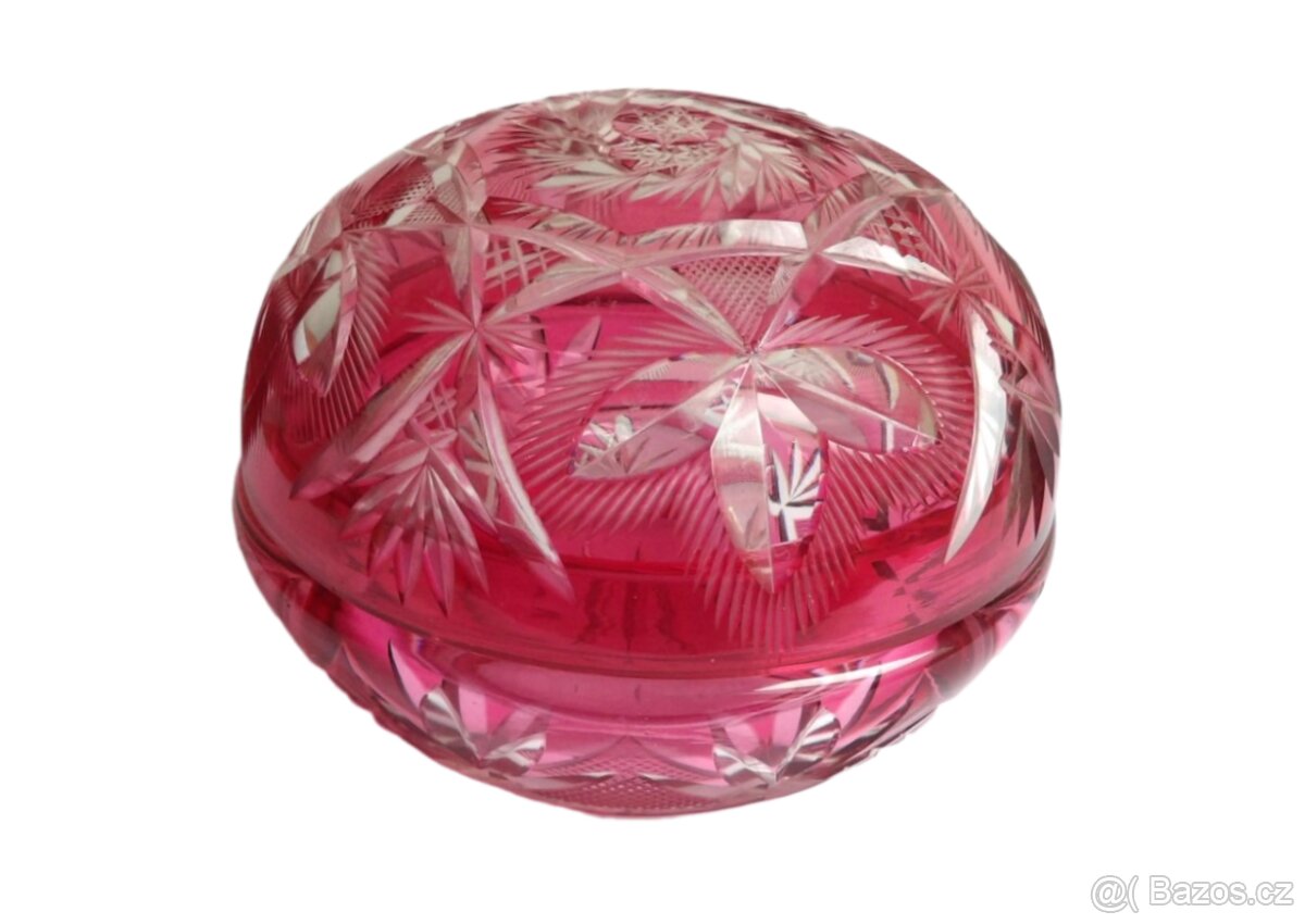 Dóza na cukrovinky z 30 tých let 20. století, růžové tónované sklo zdobené celoplošným broušeným dekorem, na dně vybroušená hvězdice, průměr 12 cm, výška 9 cm, kvalitní zabalení je samozřejmostí, poštovné od 75,-Kč.