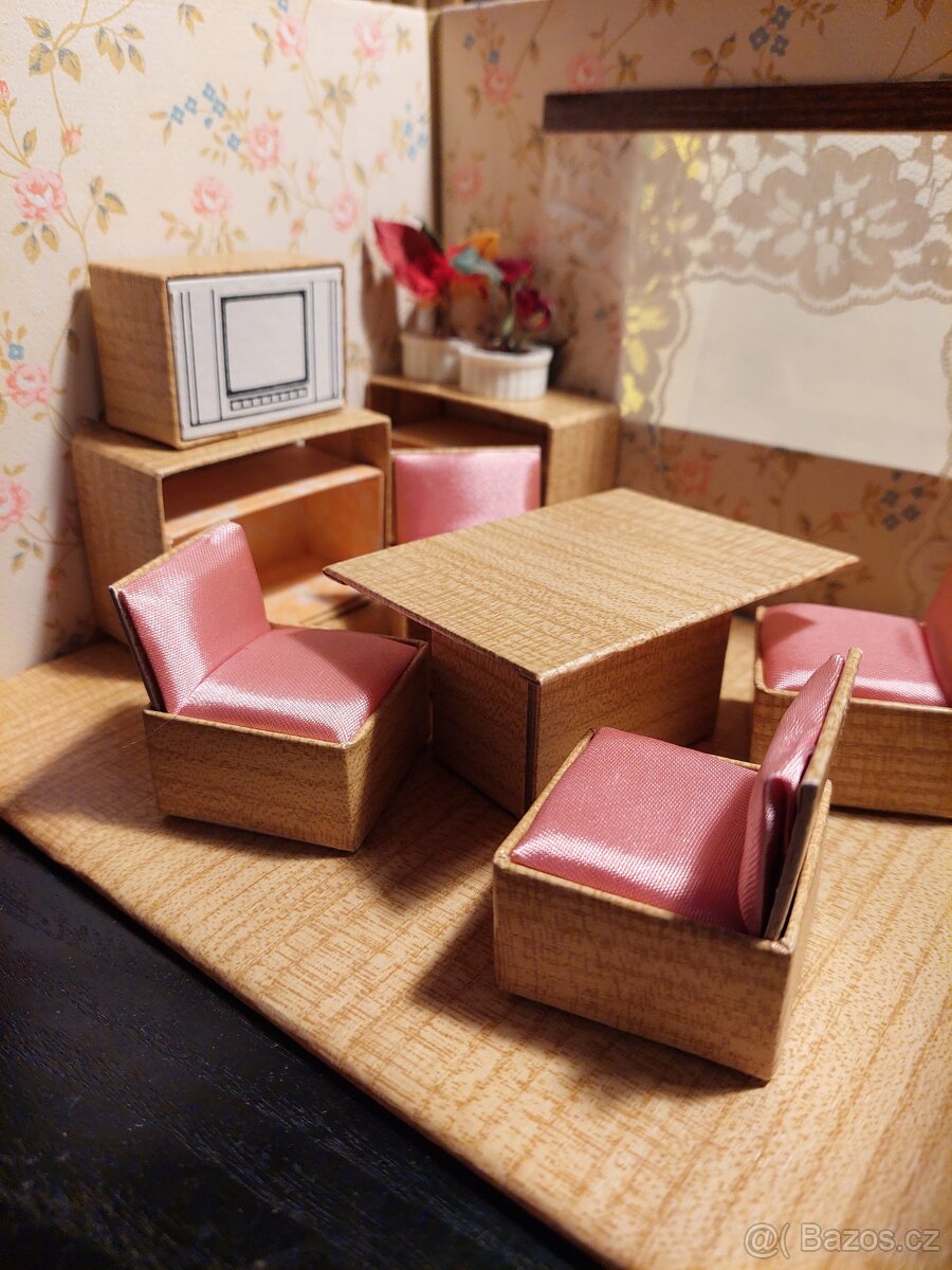 Zachovalý retro pokojíček pro panenky. Dvě modelové mistnosti - ložnice a obývací pokoj. Navíc dvě dobové malé panenky. Dopravu hradí kupující. Zasílám i na dobírku přes zásilkovnu. Osobni předání možné v Praze (Dejvice, Skalka, případně Vysočanská).