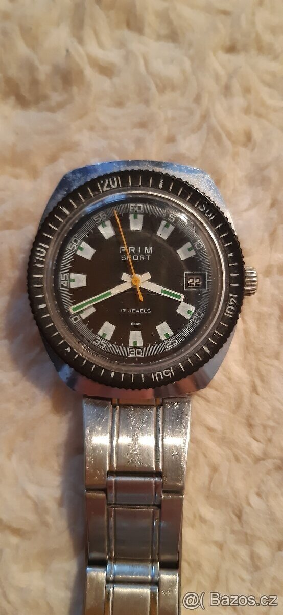 Prodám mechanické hodinky PRIM SPORT, vyrobené kolem roku 1980. Vodotěsné (3,9 atm) a nárazuvzdorné pouzdro, 17 rubínů. Zcela funkční.