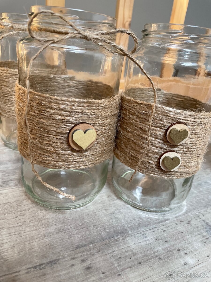 Sklenice o obj. 0,7l zdobeny v přírodním stylu,jutou a drevenymi srdicky. Svatební dekorace vhodná na kytky nebo svíčky.