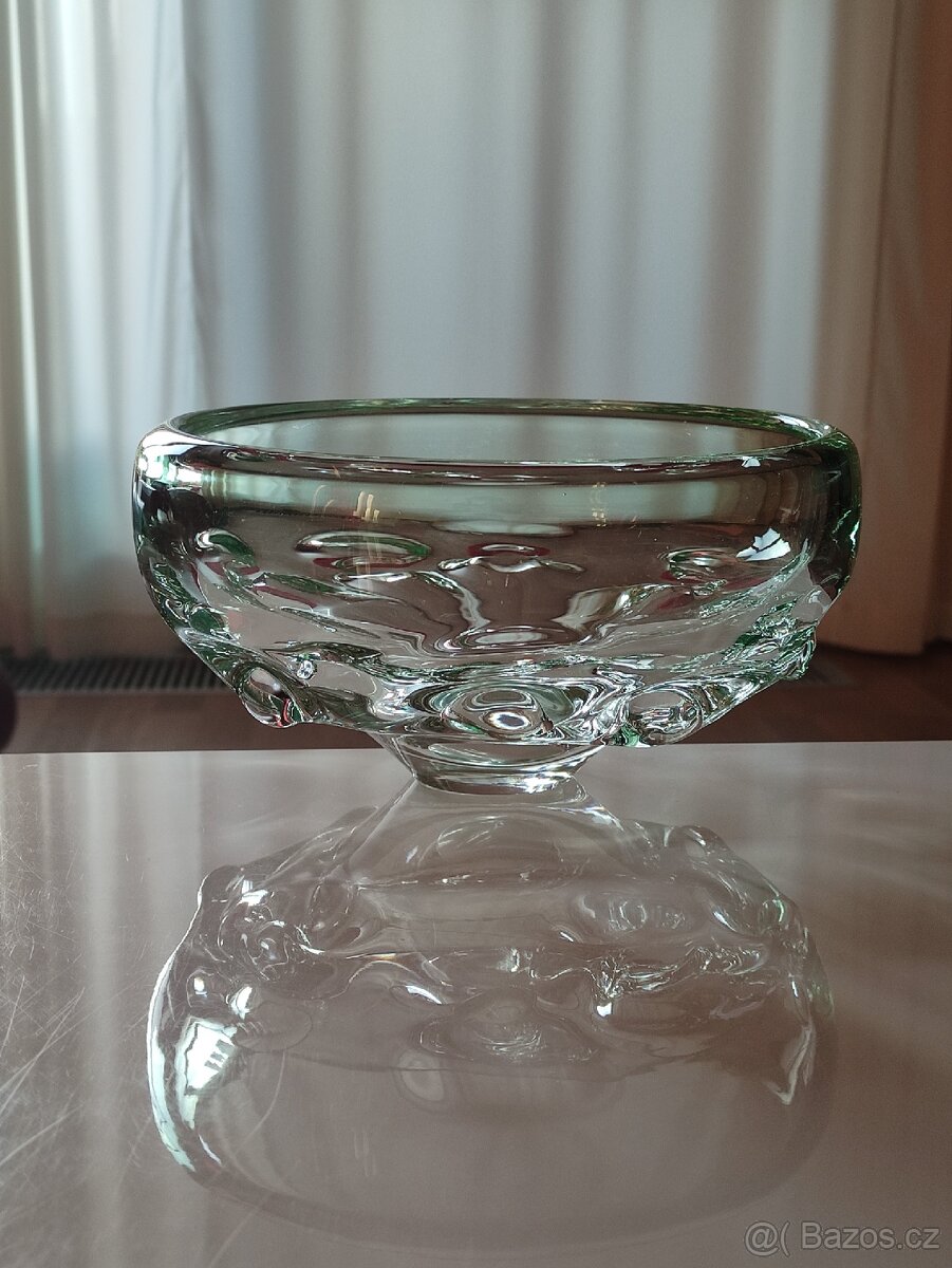 Krásná mísa - bowl, hutní sklo, světle zelená, sklárna Škrdlovice, 70. léta, návrh Ladislav Paleček. Výnikající stav, výška 10, průměr 20 cm. Při koupi s vázou (viz. jiný inzerát) cena celkem 1390 Kč.