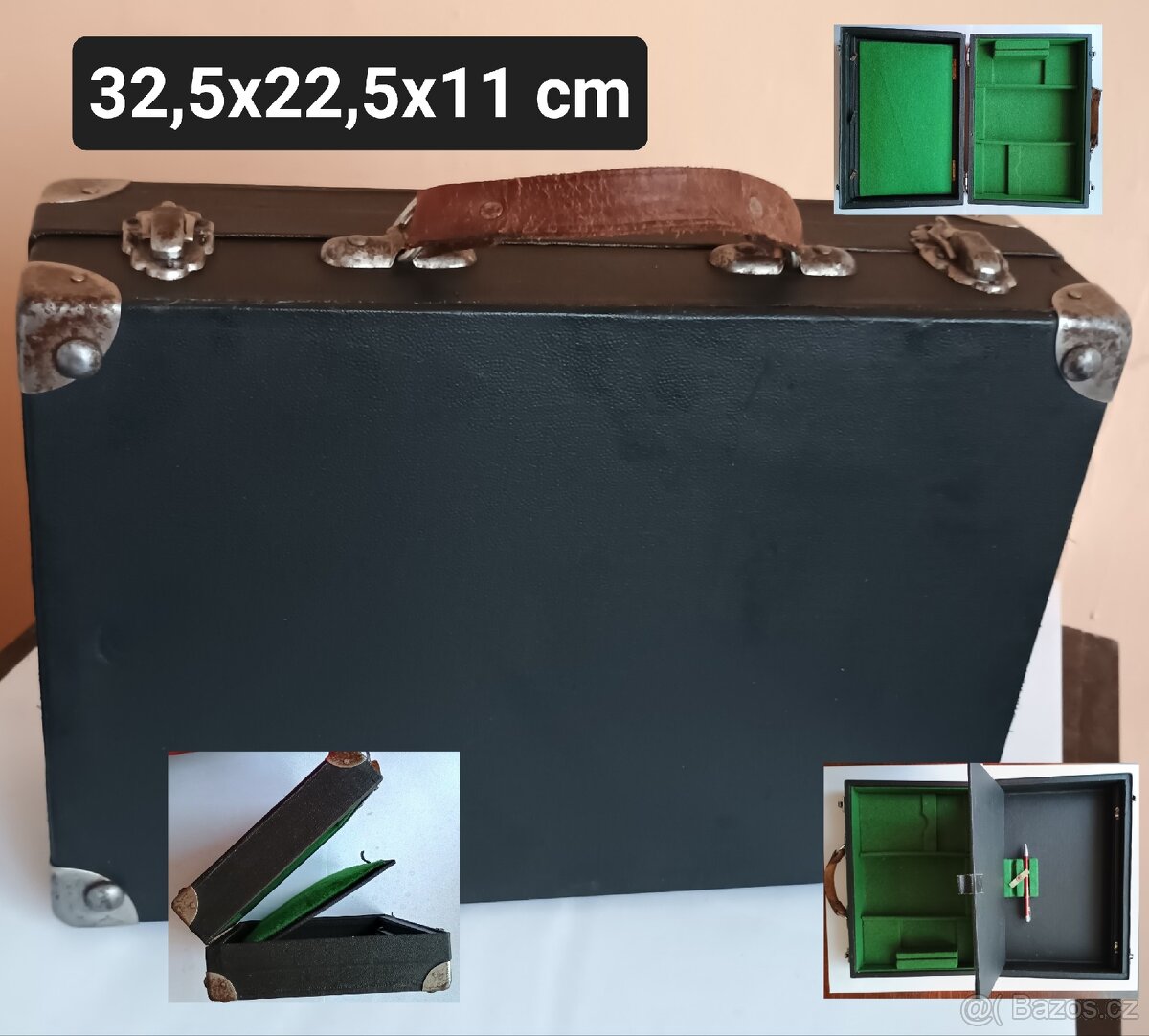 Materiál : dřevo x koženka, Fe rohové kování, panty, kožené madlo, vnitřní zelené polstrování ochrannou (zčásti měkkou) plstí