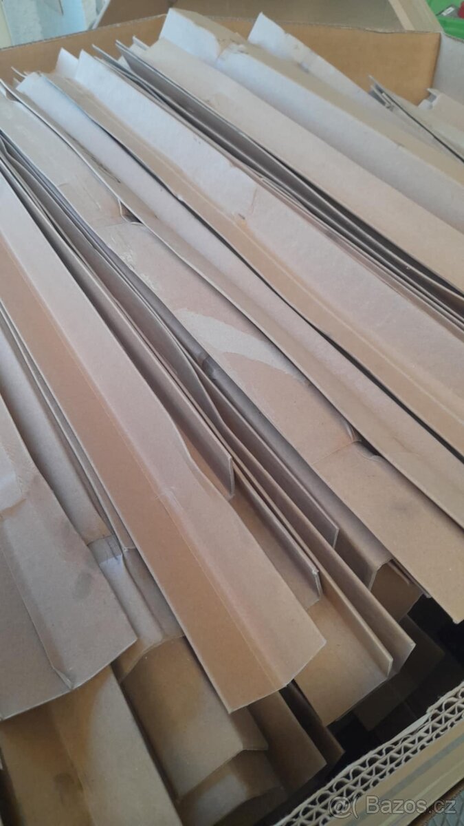 Prodám velké množství kartonových ochranných rohů. Délka cca 75 cm . Dají se použít na nábytek při přepravě nebo olemování materiálu na paletě cena za 1kg.