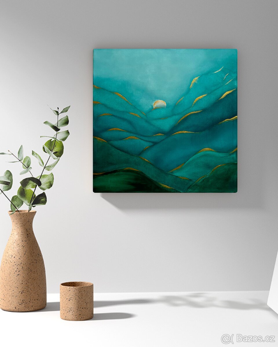 • Design: Moderní abstrakce v uklidňujících tyrkysových a smaragdových tónech s metalickými zlatými detaily.