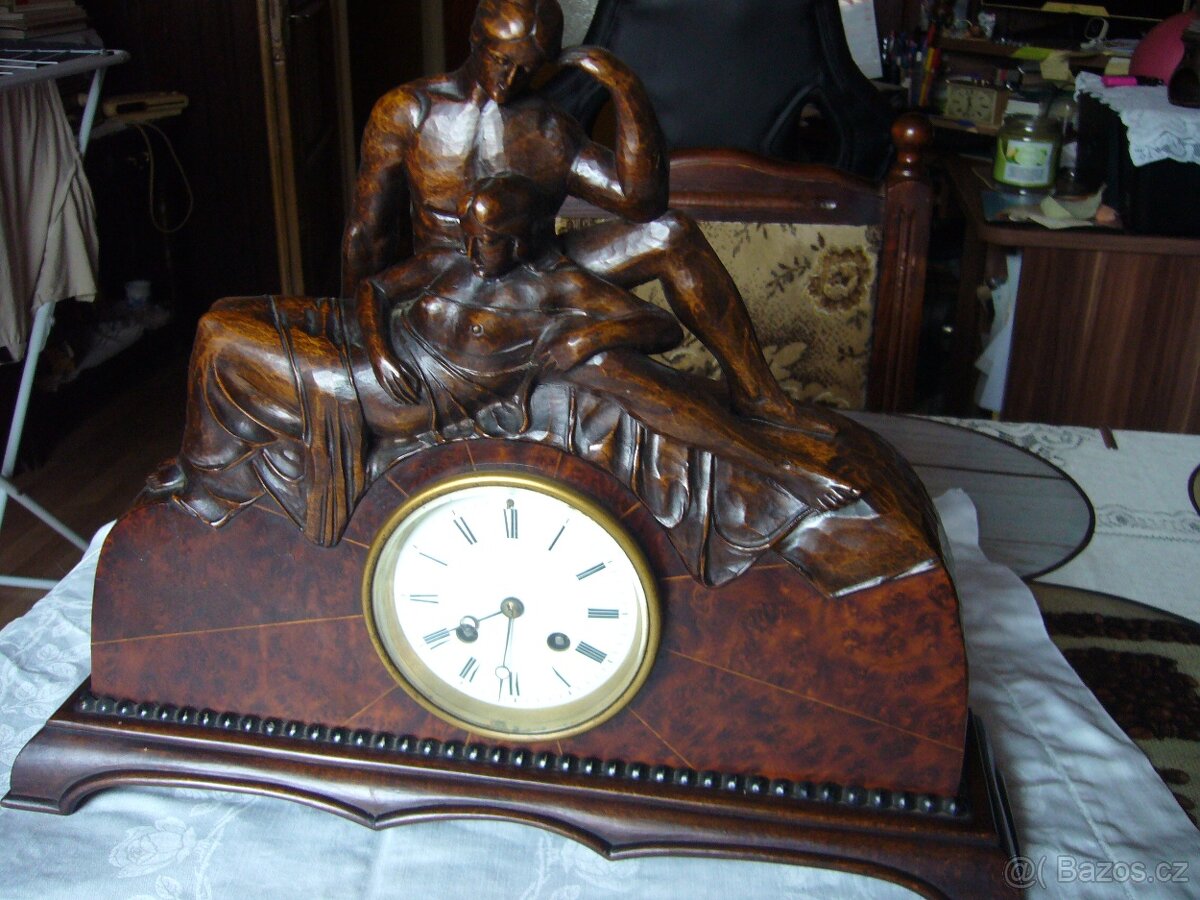 Dřevořezba velmi pěkná, hnědé dřevo paprskovitá světlá intarzie délka cca 46 cm výška 33 cm, rozprodej sbírky , hodiny byli když jsme je kupovali funkční bohužel po 40 letech nebyli v hodu možná stačí jen vyčistit když otočím ručičkami tak bijí ale vícekrát než mají, krásný nevídaný kousek pro sběratele pouze osobní převzetí