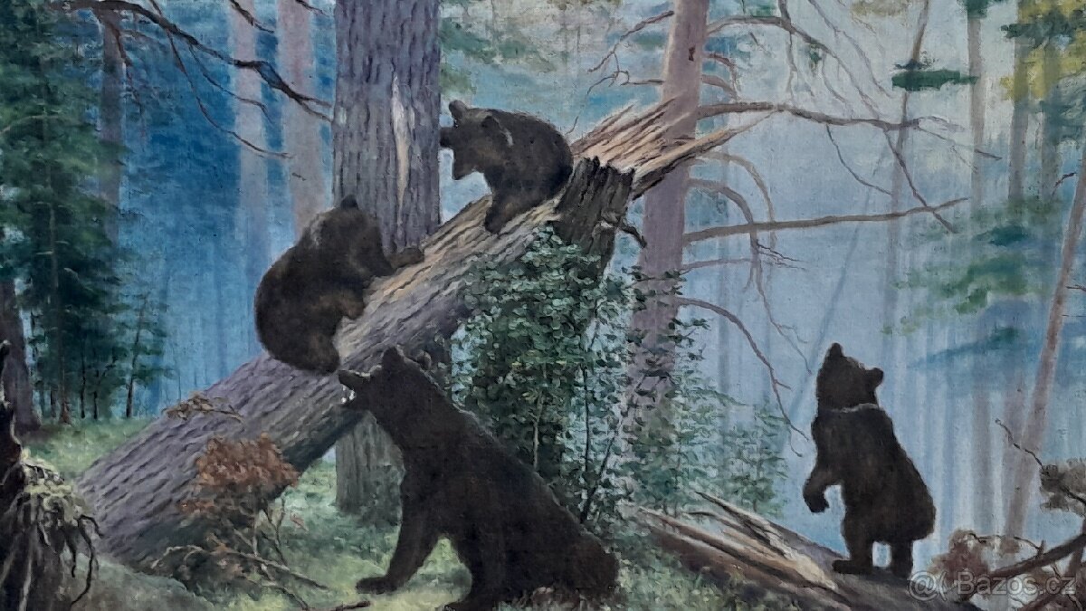 PRODÁM Obraz na plátně rozměry v.75cm×d.116cm, medvědi v lese ,ručně malovaný, ,cena 4.000 kc dohoda