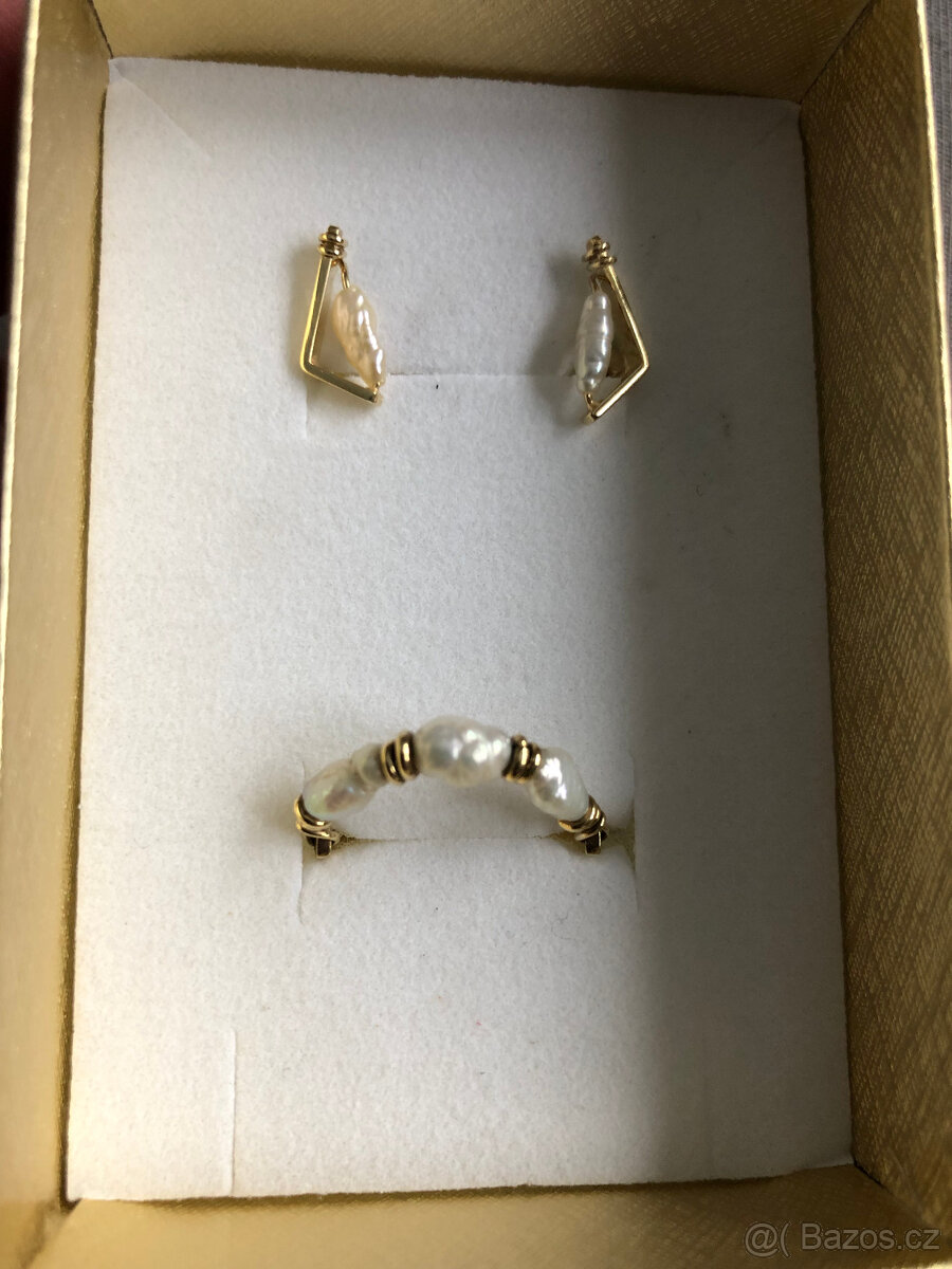 Prodám zlatou soupravu s perličkami, Au 585 , prsten velikost 52, ruční práce, celková váha 3,19 g, nové, stav viz foto
