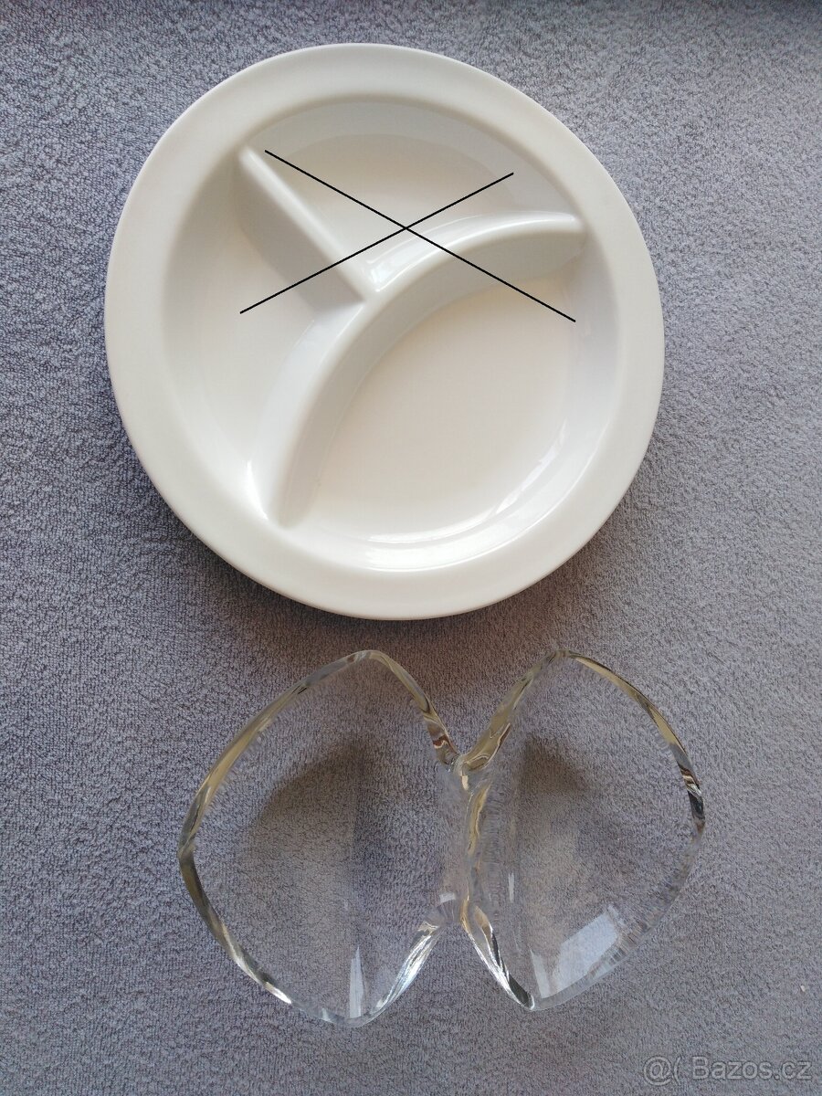 nabízíme zřídka použité nádobí k servírování, dělený talíř prodán, skleněná miska délka 19,5 cm. Balíkovna 65 Kč.
