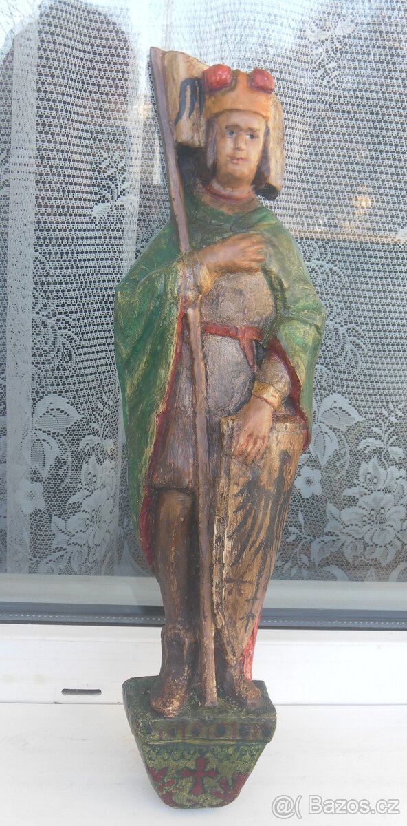 Dřevořezba Sv. Václava, viz. foto. Výška 44 cm. V pěkném stavu. Poštovné 150,-Kč.