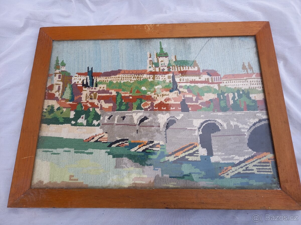 Prodám starý ručně vyšívaný obraz Hradčany a Karlův most viz foto.
