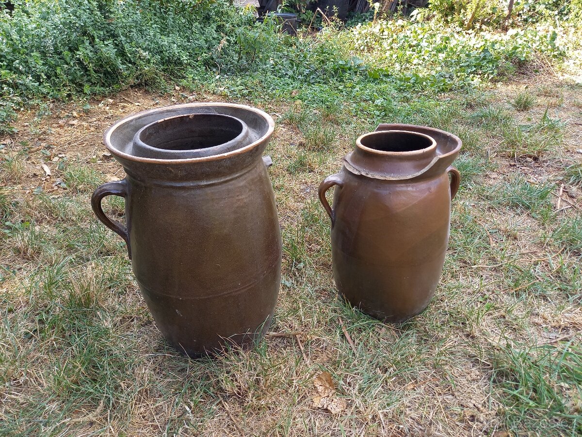 Prodám dva keramické soudky - zeláky v nálezovém stavu viz foto, bez vík.