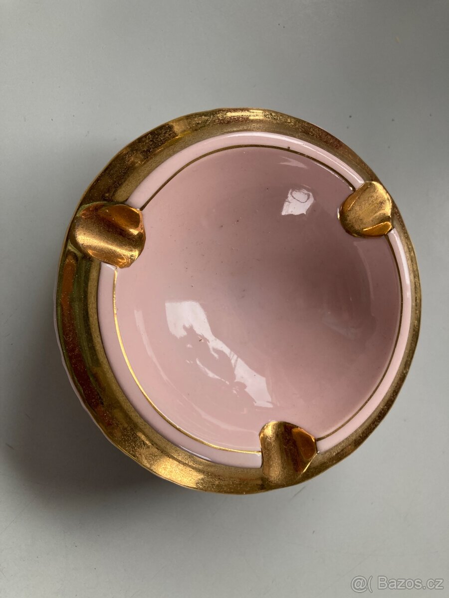 Prodám značený popelník z růžového porcelánu se zlatým lemováním. Porcelánka Chodov. Rozměry : průměr 11 cm a výška 4,5 cm.