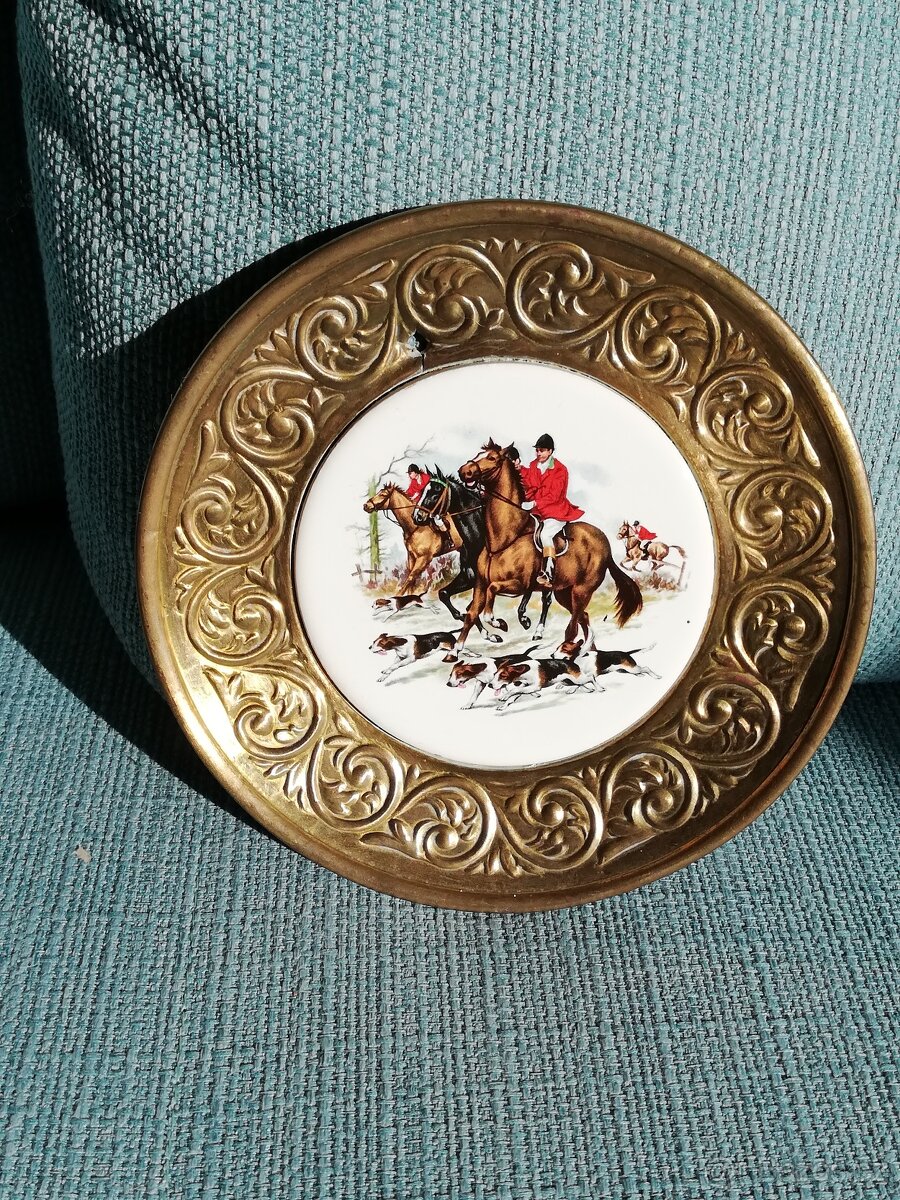 Prodám ozdobný kovový talířek s motivem loveckého honu – jezdci na koních a lovečtí psi. Talířek má průmět 15 cm, je v něm otvor na zavěšení.