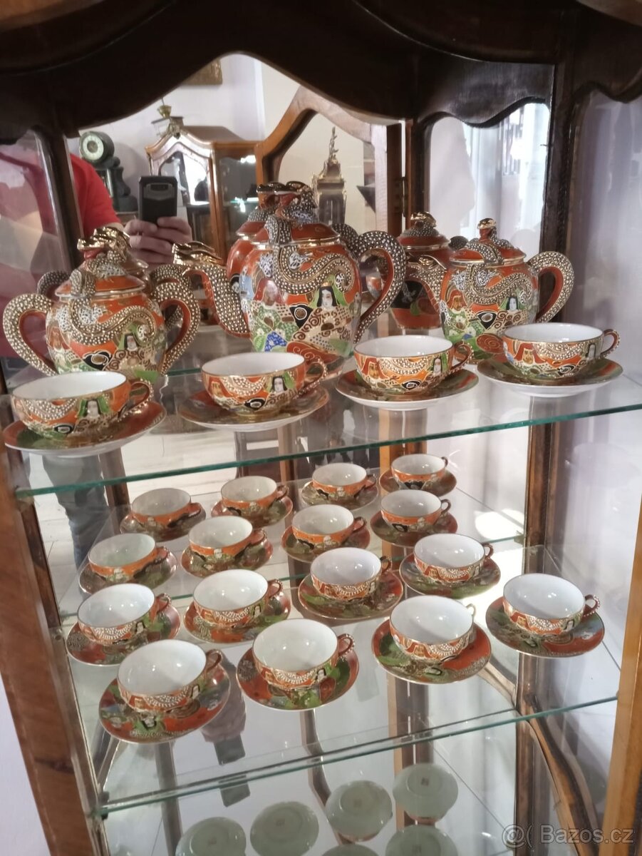Dvanácti osobní čajový servis (12 šálků/podšálků). Porcelán, ruční malba, dračí tématika cca 1940.