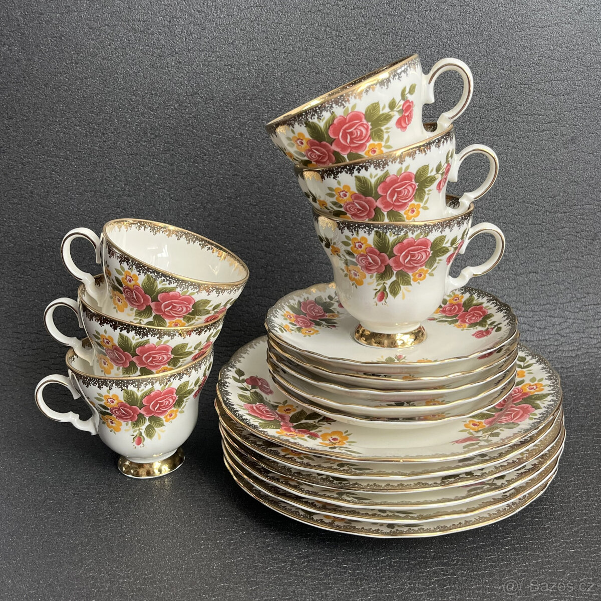 Porcelánový set, servis v barvě slonové kosti s bohatým květinovým a zlatým dekorem na kávu a čaj. Souprava obsahuje 6x šálek objem 150ml, výška 7.5 cm, 5x podšálek 13.5 cm (chybí jeden kus), 6x dezertní talíř 19 cm. Vyrobeno německou porcelánkou Winterling, konec 20.století. Velmi dobrý stav bez prasklin, 2x dezertní talíř - plochý oťuk zespodu, výrobní nedokonalosti (ploché oťuky pod zlatou linkou), vrásky z výroby vedle uch viz foto. Cena je za sadu.