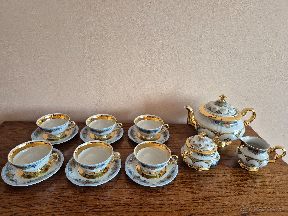 Čajový set - [8.2. 2026]Kompletní čajový servis, malovaný čtrnácti karatovym zlatem, nepoužívaný pouze vystavený.