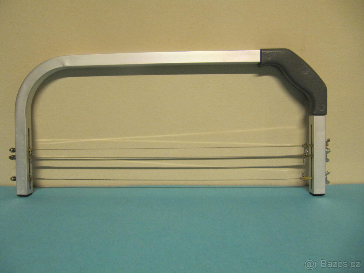 pro výrobu dortů, řezání pater, 3 pilky, lehká hliníková konstrukce, nivelátor, plastové madlo, vnitřní šířka 46cm, výška 21cm, nastavení řezu 1-10 cm