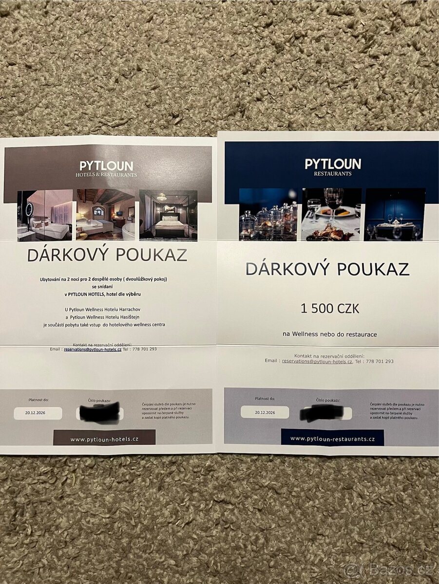Prodám 2 dárkové poukazy do hotelů a restaurací Pytloun.