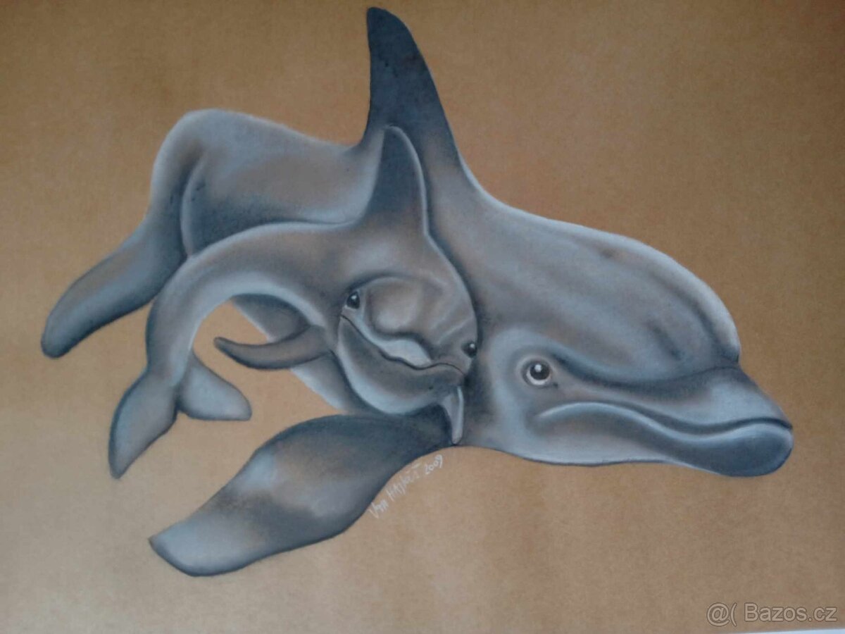 Obraz delfíni, pastel, k zarámování.