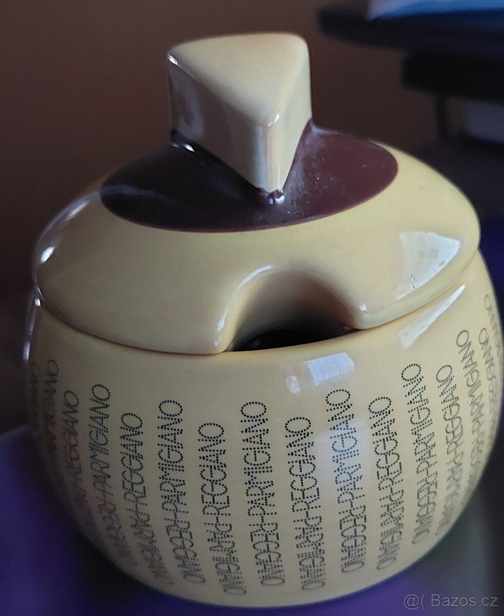 Prodám porcelánovou dózu Consorzio (Parmigiano Reggiano). Výška bez víčka 5,5 cm, s víčkem výška 9 cm, průměr 8 cm.