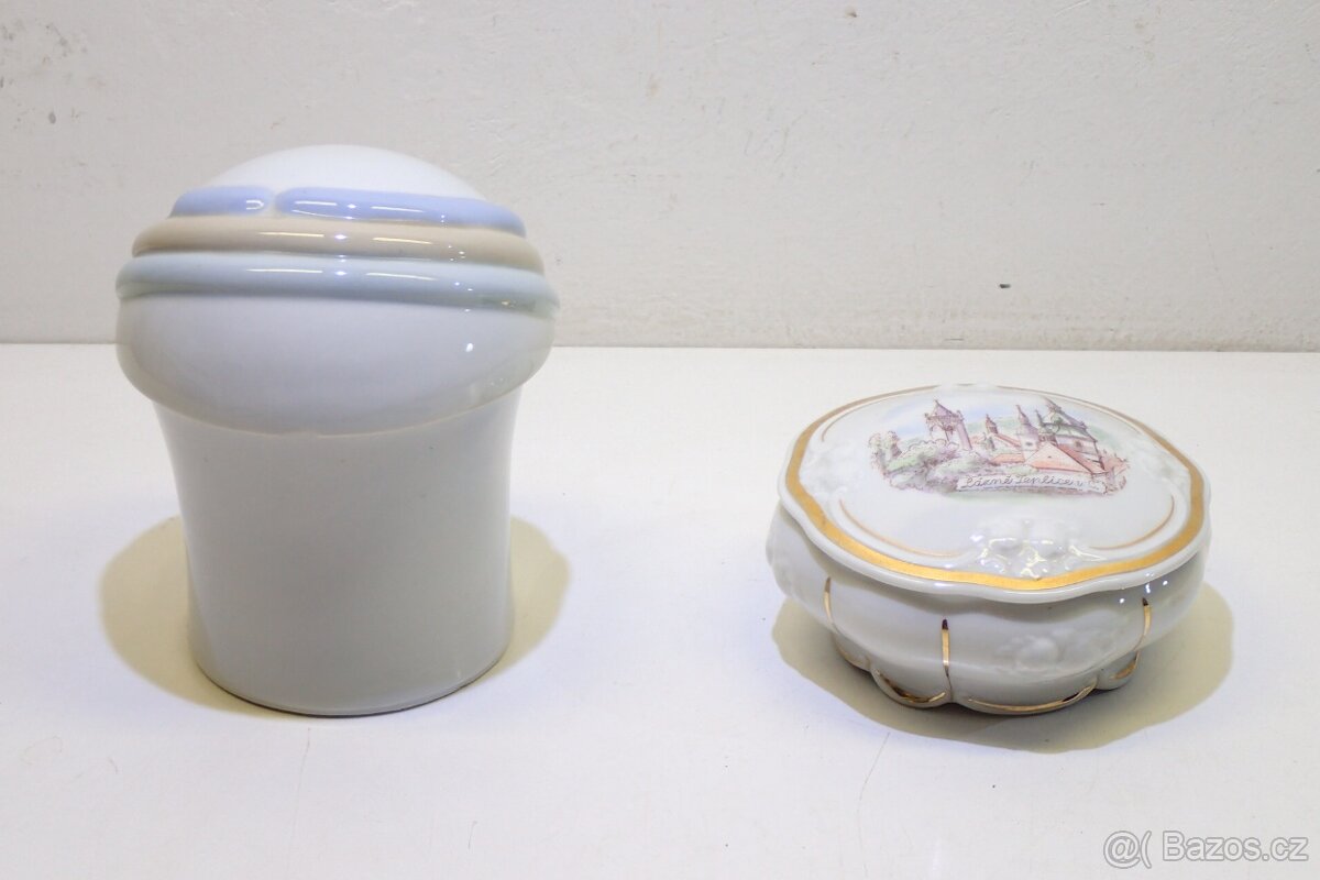 Prodám 2 RETRO dózy - výška dózy Royal Dux: 15cm a její průměr: 12cm - průměr dózy ,Lázně Teplice v Č.': 13cm - poškození nafoceno - jinak stav viz foto.