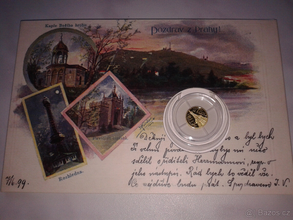 Prodám zlatou minci 2 a 5 NZD o váze 0,5g, kvality poof, průměr 11 mm, ražba ČM a vloženou do Dobové pohlednice -- Petřín - 1780 Kč, Devínsky hrad - 2000 Kč a Fidlovačka - 2020 Kč. Platba předem na účet + poštovné.