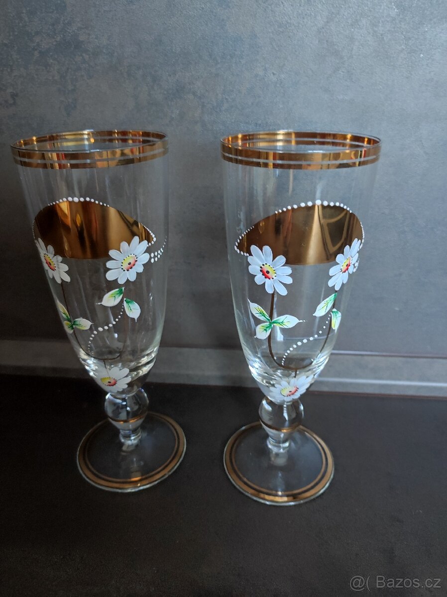 Prodám sadu dvou hezky zdobených skleniček, výška 18,5 cm. Předání v Ústí nad Orlicí Hylvátech