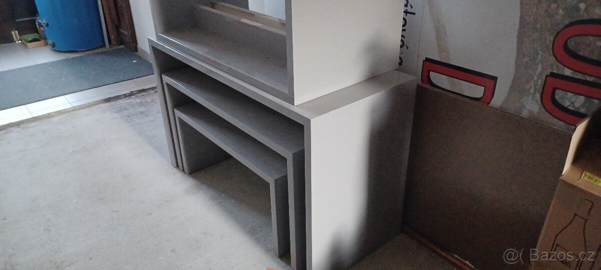 Dobrý den, prodám sestavu stolů o rozměrech 100x45cm,druhý 120x65cm ty jsou dva, 140x85cm. Ten největší stůl má poškození viz foto. Cena dohodou.My jsme stoly měli pro prezentaci obleční na obchodě.Za odvoz