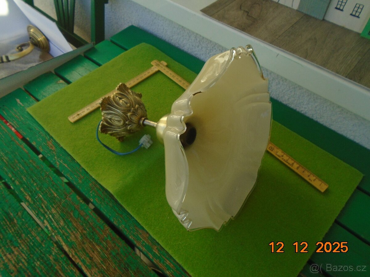 mosazná stropnice, lustr krémové otevřené stínidlo - [11.2. 2026]Prodám pěkný starý mosazný lustr, skleněné původní krémové otevřené stínidlo , výška stropnice od stropu je 25 cm, průměr stínidla je 19 cm, nová elektroinstalace.