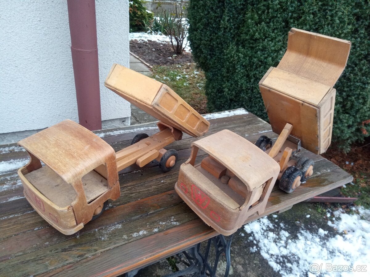 Prodám dvě dřevěná auta, stav viz foto. Cena 600,- Kč za obě.