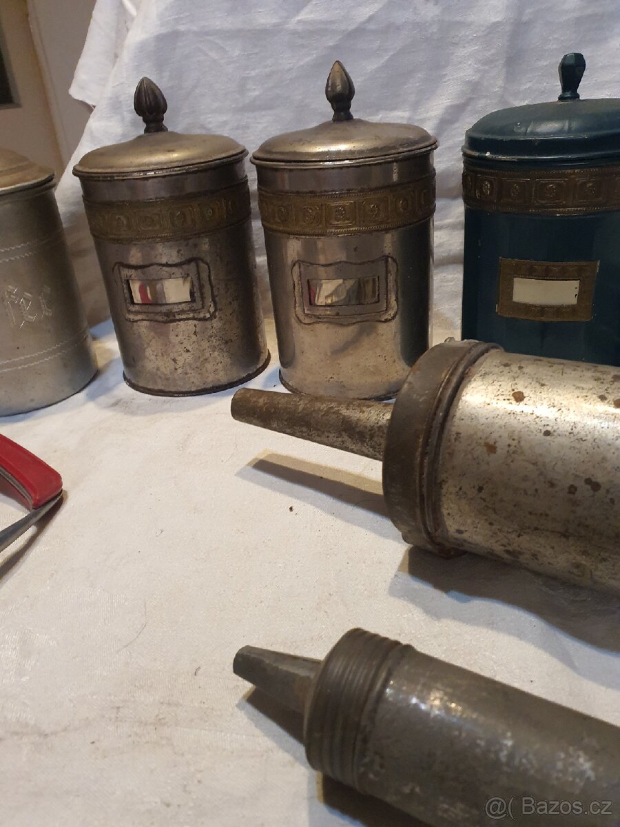 Prodám staré plechové kořenky-ruční mixér-forma na bábovku-panička jitrnic -nalezovy stav-výška kořenky-18cm-nabidnete