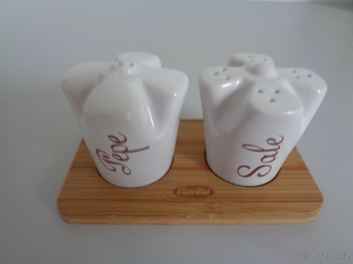 Prodám porcelánovou slánku a pepřenku na destičce 7,5 x 13 cm. Výška včetně destičky cca 7 cm. Nepoužívané.